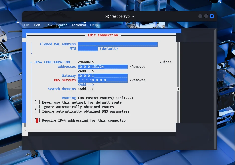 # Navigate: Edit a connection β eth0 β IPv4 Configuration β Manual
